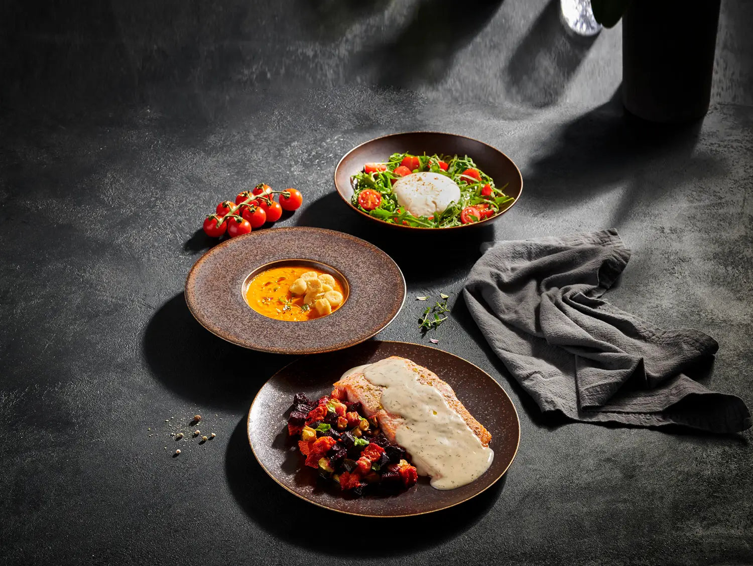 Ausdrucksstark, edel, modern: Die Kollektion „Forte” ist mit ihrem semi-matten Finish und der tiefschwarzen Glasurfarbe ein echter Statement-Piece für anspruchsvolle Tischkultur. Aus hochwertigem Porzellan gefertigt, besticht jedes Teil durch die moderne Coupe-Form – eine klare Linie, die Ihre kulinarischen Kreationen perfekt in Szene setzt. Absolut pflegeleicht, spülmaschinen- und mikrowellengeeignet sowie stapelbar.