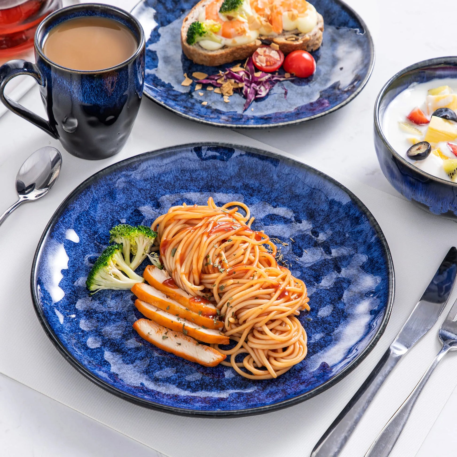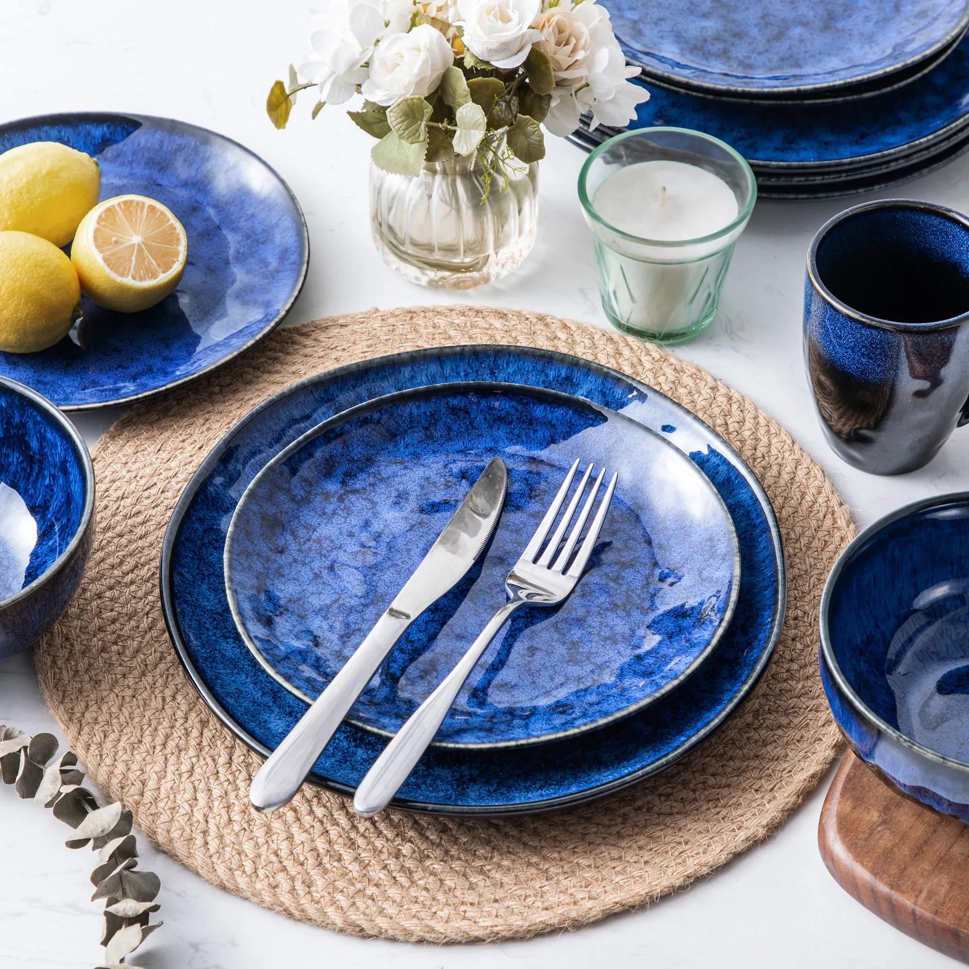 Das tiefblaue Steingut Geschirrset bringt eine edle Note auf Ihren Tisch. Das zeitlose Design passt zu vielen Tischdekorationen und macht jedes Essen besonders. -
